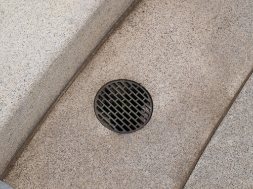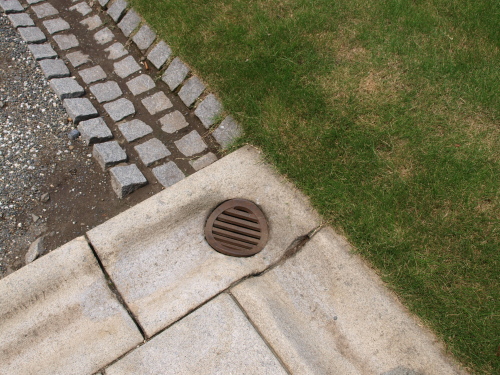 そしてこれは前庭・石畳と芝生の境目にある排水用の溝と排水口。