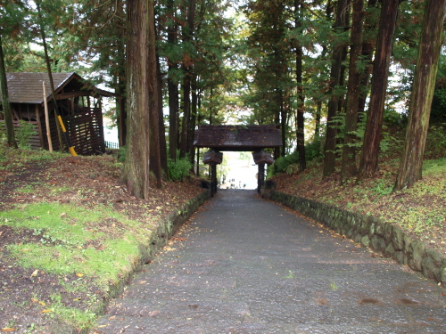 「階段を下り」の階段がこちら。左側に写っている小屋?が矢除石の場所らしい。