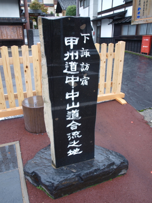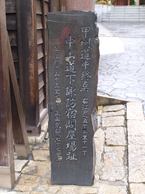 下諏訪宿場問屋場跡の石碑。こちらにも江戸までの距離が。