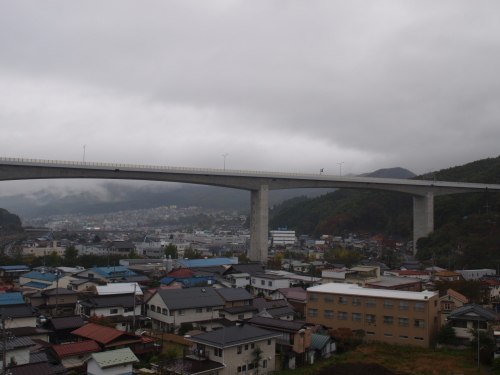 山を背景に立ち並ぶ家屋と、その上空を通過していく高速道路。