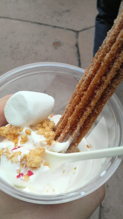 まだ温かいメイプル味のチュロスと、ソフトクリームの組み合わせ。